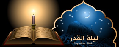 Laylat al-Qadr banner, website header template. Jabal al-Nour mountain with Hira cave, moon crescent, stars, sky, candle, open Quaran, surahs At-Tin 95, Al-Alaq 96, Al-Qadr 97, Al-Bayyinah 98. Arabic text translation Laylat al-Qadr