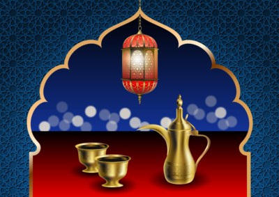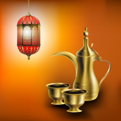 Ramadan iftar party food vector illustration. Traditional eastern dallah coffee pot with two cups of bitter coffee Khaleeji and arabic lantern. Oriental arch and ornament. Royalty-free stock Ramadan concept, theme, category images, photos, graphics, vectors for you creative projects and designs. Cute Ramadan photos Pinterest