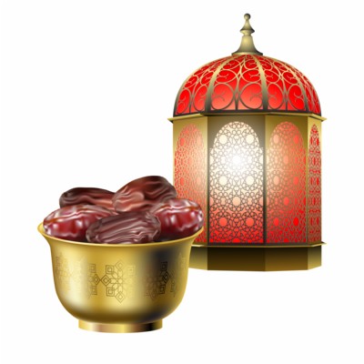Retro vintage arabic burning lantern with oriental ornament and bowl with dried dates. Vector realistic 3D image isolated on white background Royalty-free stock Ramadan concept, theme, category images, photos, graphics, vectors for you creative projects and designs. More photos here Photo blog