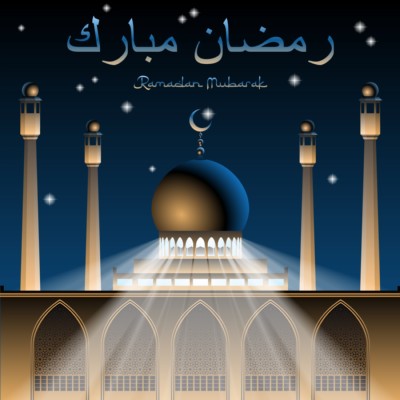 Ramadan Mubarak Illuminated mosque with star and crescent symbol and rays of light on dark blue night sky with stars background. Arabic text translation Ramadan Mubarak Royalty-free stock Ramadan concept, theme, category images, photos, graphics, vectors for you creative projects and designs. Best Ramadan vectors for your design