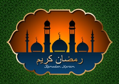 Ramadan Kareem golden arabic text on a silhouettes of mosques and minarets on sunset sky in golden arabic frame on green background with girih traditional ornament. Arabic text translation Ramadan Kareem Royalty-free stock concept, theme, category images, photos, graphics, vectors for you creative projects and designs. Cute photos